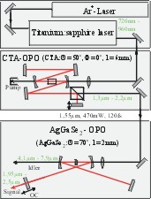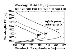 Tuning of the AgGaSe2-OPO can be accomplished either by using a fixed pump wavelength from the CTA-OPO and rotating the AgGaSe2 crystal, or by keeping a fixed crystal angle and changing the pump wavelength by changing the titanium:sapphire wavelength. This is illustrated below.