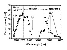The figure above shows the average output power of the signal and idler wave as a function of wavelength. The maximum average signal output power of 26 mW was measured at 2.2 µm. The idler power exceeded 22 mW at 5.25 µm. The idler wave is partly absorbed by CO2 at 4.25 µm and H2O vapor which has a broad absorption band that is centered at 6.27 µm. All these measurements were performed with a 2.0% output coupler in order to have low threshold power and small losses which allows for a large tuning range. With an output coupler with 7.2% transmission and a pump power inside the crystal of 403 mW an average output power of 67 mW and 35 mW was measured for the signal and idler wave, respectively.