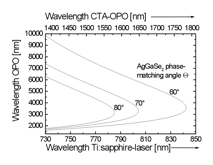 Phasematching curve of the AgGaSe2-OPO pumped by a CTA-OPO calculated with the Sellmeier equations