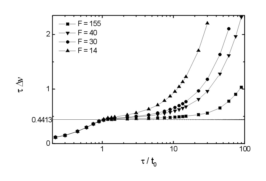 Time-bandwidth product (tDn ) in dependence of the ratio of the duration (t) of Gaussian pulses to the round trip time (t0 ) calculated for different values of the finesse (F)